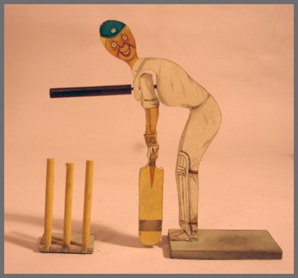 The figures, picture below, are from a game I would guess is from the ’30s, which carried the famous Jack Hobbs name. I got both figures as part of a job lot with an old copy of Stumpz. They are really wonderfully eccentric, hand painted, oddities.