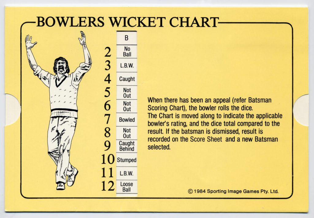 This popular and well produced game was created in the 80s and picked up by a professional publisher and produced for many years. As a result it’s easy to pick up a copy and well worth it. The game mechanic is fairly identical to Stumpz (if one is in a generous frame of mind, you would say it’s “inspired by Stumpz”) and like that venerable game, it has a lovely tactile feel to it with a solid board, playing pieces (using the same moulds as Subbuteo Table Cricket) and lots and lots of cards. The game itself is somewhat flawed, but if you are willing to put in the time and effort, you can tweak it to be quite playable and very, very detailed. How? You do so by downloading a set of Advanced Rules by a fellow called Nigel Collier. He produced these some years ago and gave replaycricket.com permission to post them for people to download and enjoy. So why not do so now. The Advanced Rules do make the original game far better.